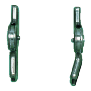 Stainless steel Medial joint has contoured lower bar and straight upper bar, straight lateral joint, free motion, with ball bearing. Joint center 16 mm to the posterior.